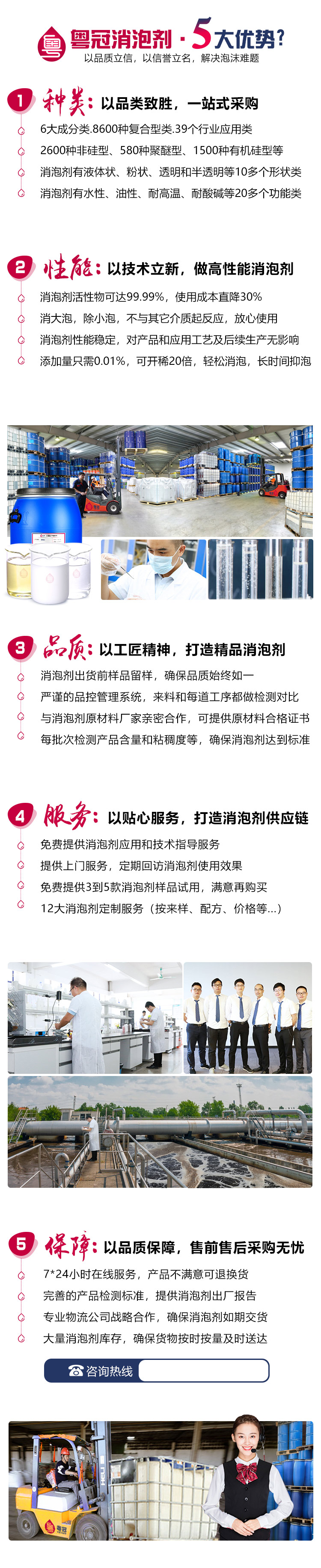 粵冠消泡劑產品廣泛應用于水處理、切削液、工業(yè)清洗、印染、造紙、涂料、粘合劑,生物發(fā)酵、電廠脫硫、石油開采等38個行業(yè)領域,有消泡解決方案3000多種類型。產品有有機硅類,聚醚類,礦物油類,高碳醇類,脂肪酸類,有單體,有復合體,有透明的,有淡黃的,有乳白的各種類型消泡劑,實現(xiàn)一站式采購。